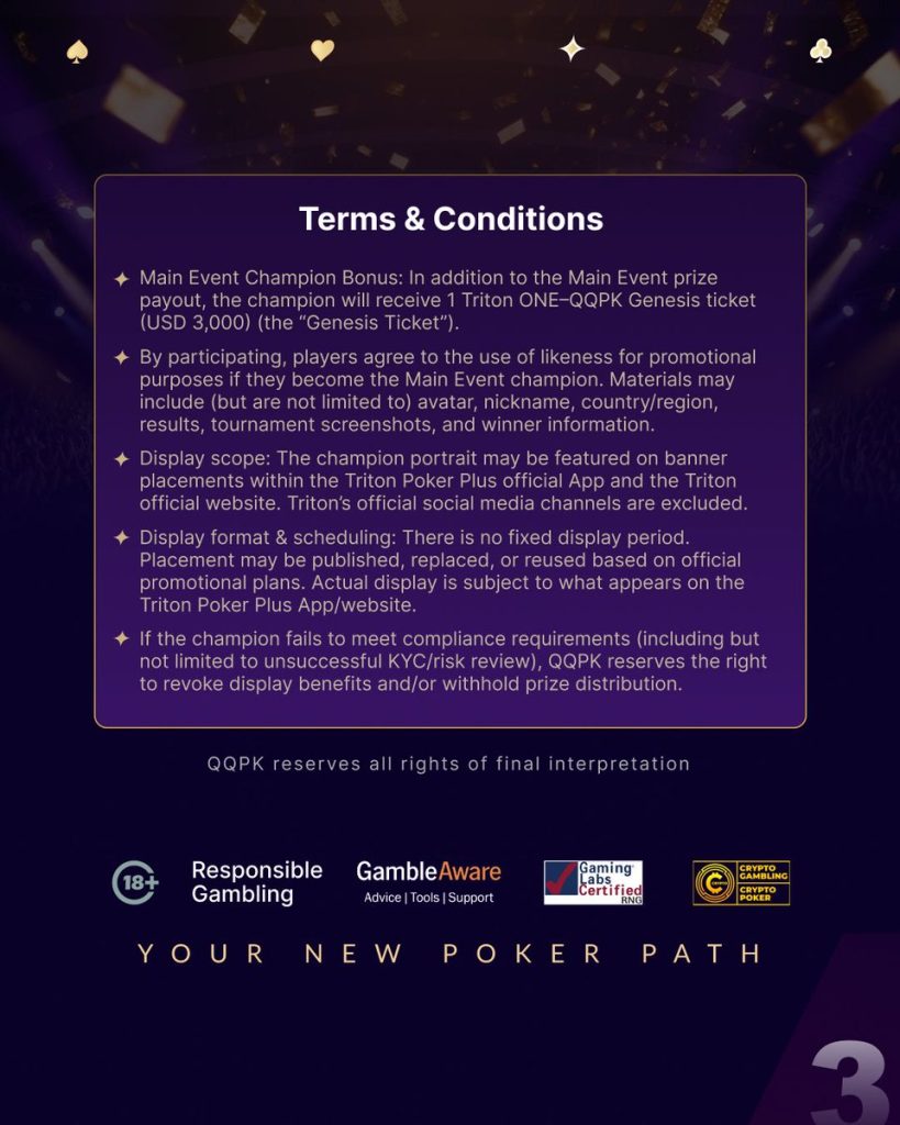 ✔ Ảnh chân dung nhà vô địch của bạn sẽ được đăng tải trên ứng dụng và trang web chính thức của Triton Poker Plus
