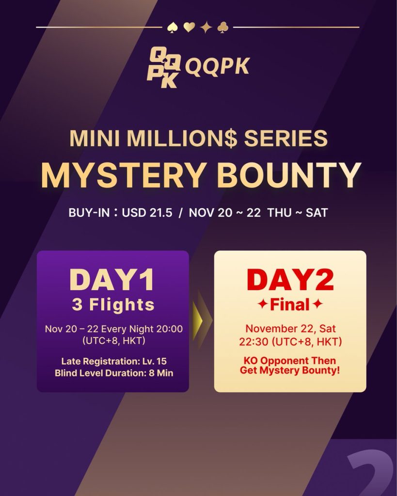 Sự kiện bounty lớn nhất của MINI MILLION$ SERIES đã đến! Mystery Bounty tuần này mang đến một giải thưởng SIÊU KHỦNG — lớn hơn, điên rồ hơn và phần thưởng hấp dẫn hơn so với các sự kiện bounty trước đó. 🏆 Tổng giải thưởng GTD: 100.000 USD 🧧 Mystery Bounty: 40.000 USD 💸 Phí vào cửa: Chỉ 21,5 USD Sự kiện chính đã đến! Giải thưởng Mystery Big Bounty đã có mặt!