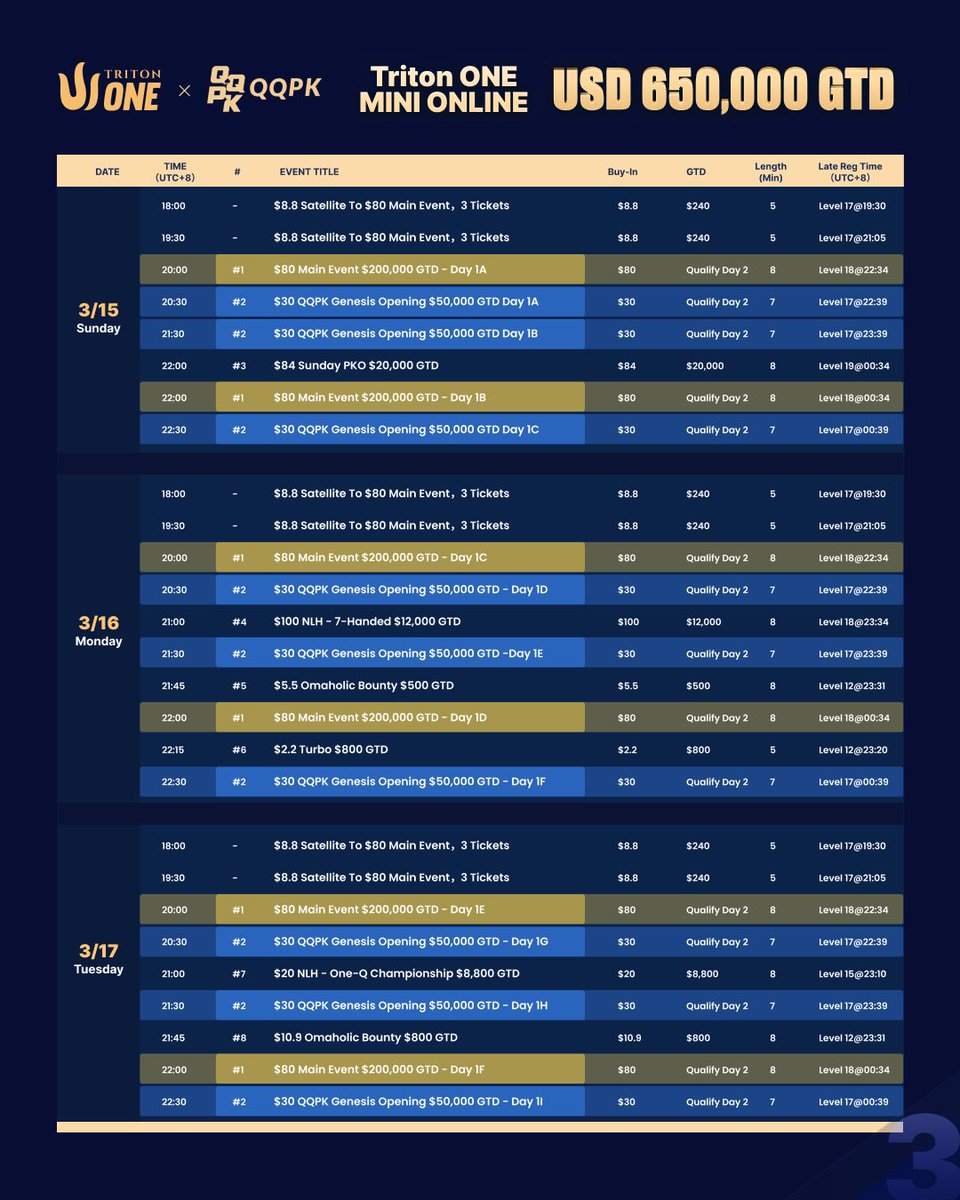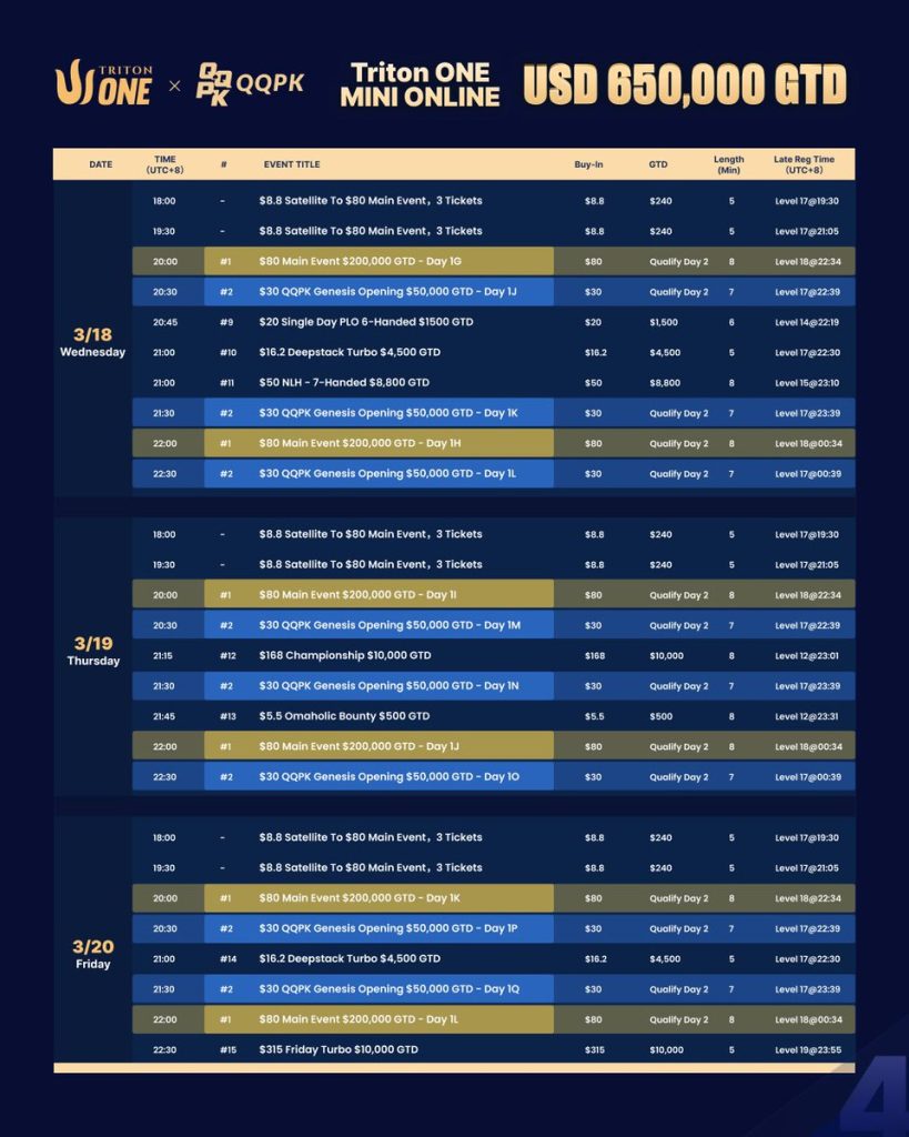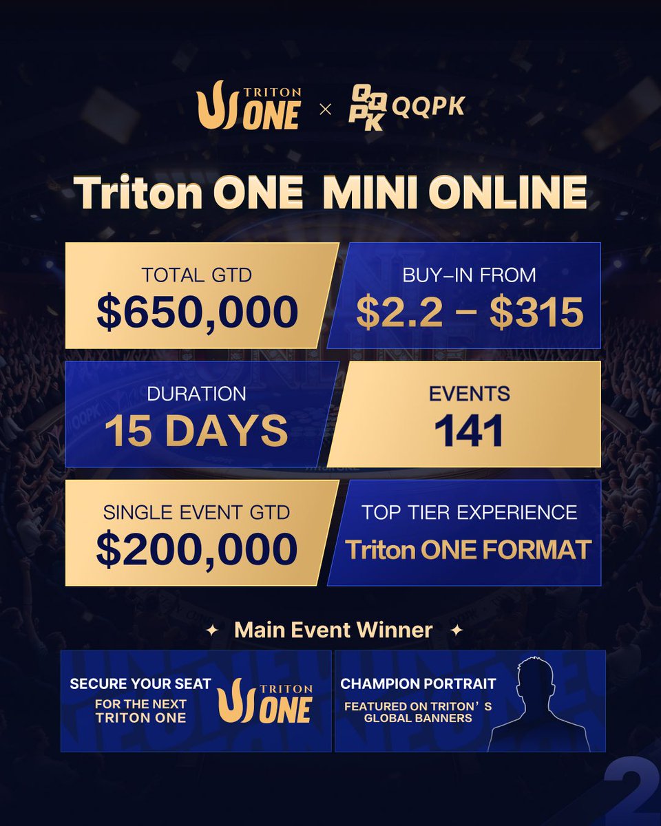 Từ ngày 15 đến 29 tháng 3, Triton ONE · MINI ONLINE tiếp tục bùng cháy trên mạng! 🔥 💰 Tổng giải thưởng đảm bảo 650.000 USD 📅 15 ngày, 141 sự kiện 🎟️ Phí tham gia từ 2,20 USD đến 315 USD Mang nhịp điệu của Triton ONE trực tiếp vào đấu trường trực tuyến. Và nhà vô địch Sự kiện Chính sẽ nhận được nhiều hơn cả danh hiệu. 🔱 Ngày thứ hai tại Triton ONE – QQPK Genesis. Chúc mừng tất cả những người chiến thắng đã dự đoán chính xác tại giải đấu #1 Triton ONE – QQPK Genesis FT 🎉
